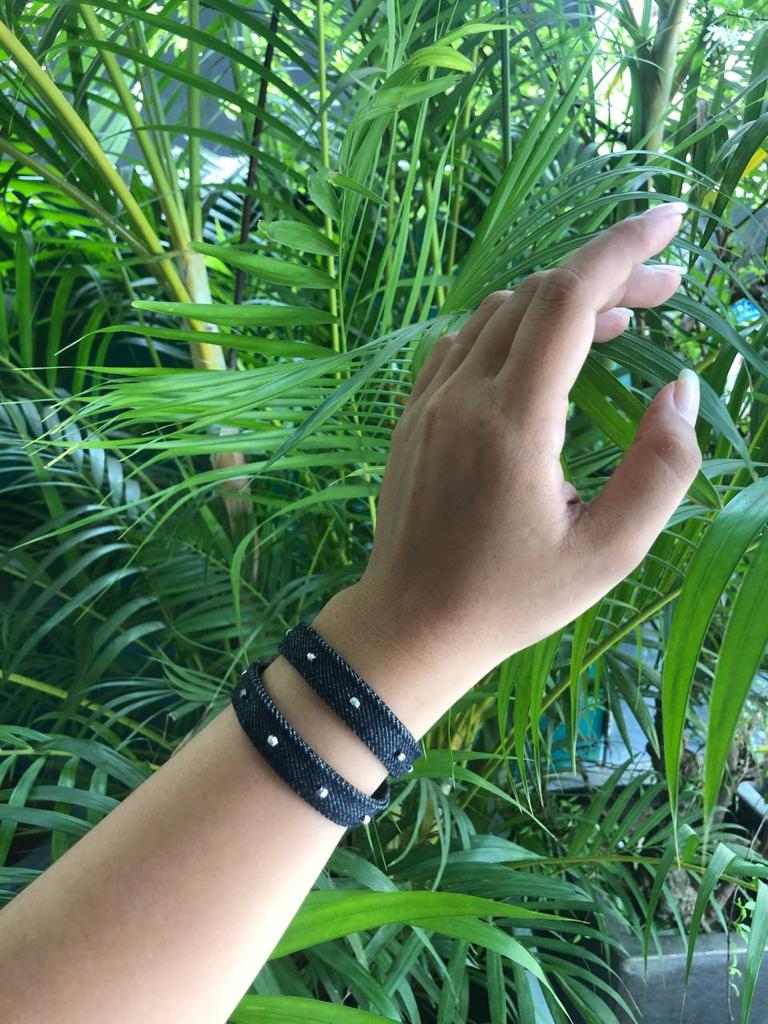 our new denim jewellery range is both stylish and environmentally friendly and features metal studs and a cross charm with safety chain.