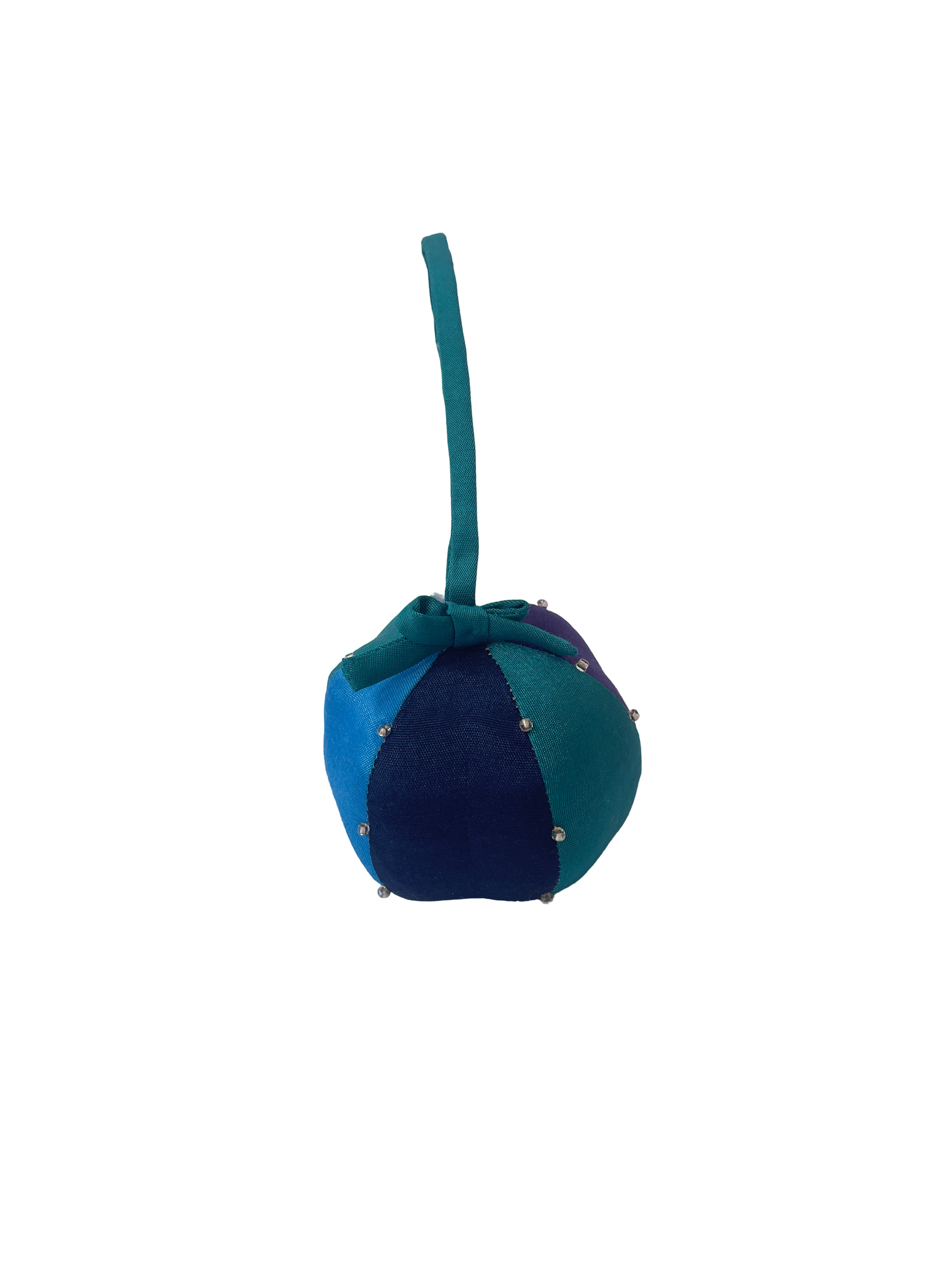 Bethlehem Christmas ball shaped fabric ornament with bells detail.