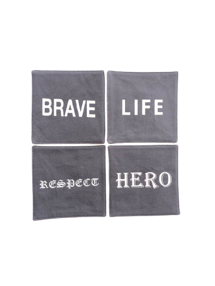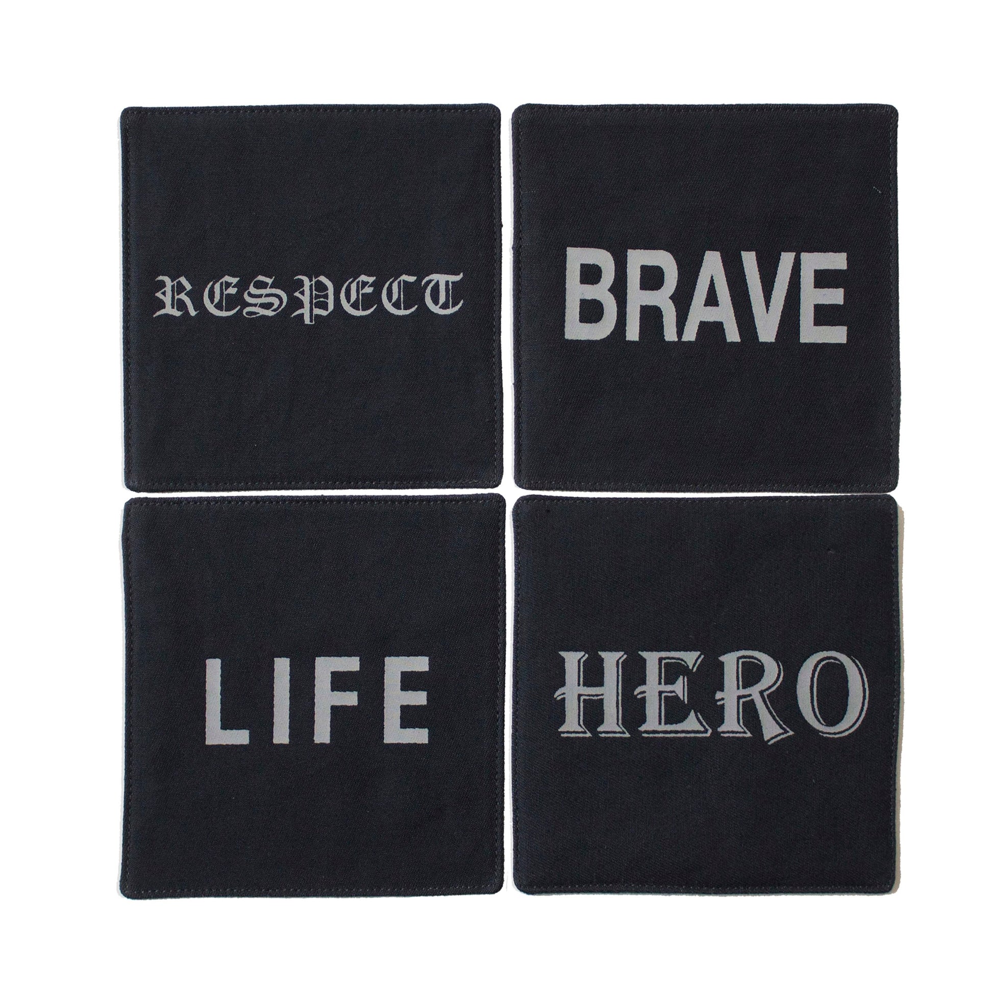 Set of 4 coasters with printed text: Respect, brave, life, and hero