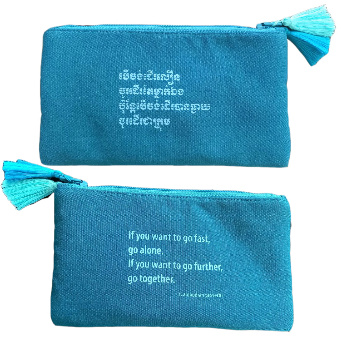 This handy purse with a Cambodian Proverb in both English and Khmer features an attractive tassel zip in turquoise blue:
