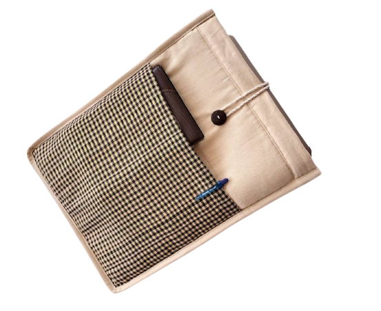 Fits standard laptops, features local Khmer krama pocket and wood button closure.