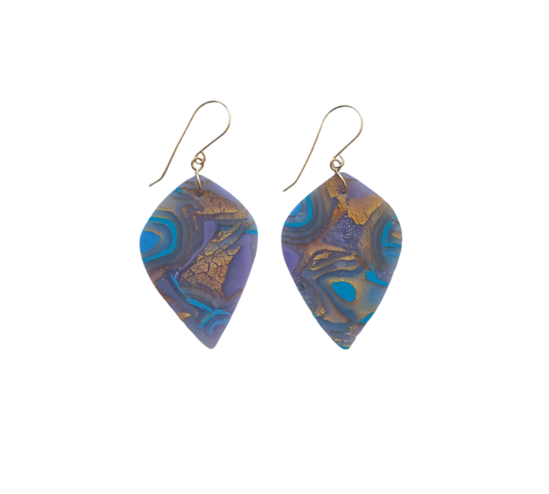 Each pair of these earrings is individually handcrafted from high-quality polymer clay, featuring a unique blend of colours that are mixed, cut, and shaped by hand before being carefully baked for lasting durability. Finished with touches of gold and silver leaf, they add a striking, artistic flair to any outfit.